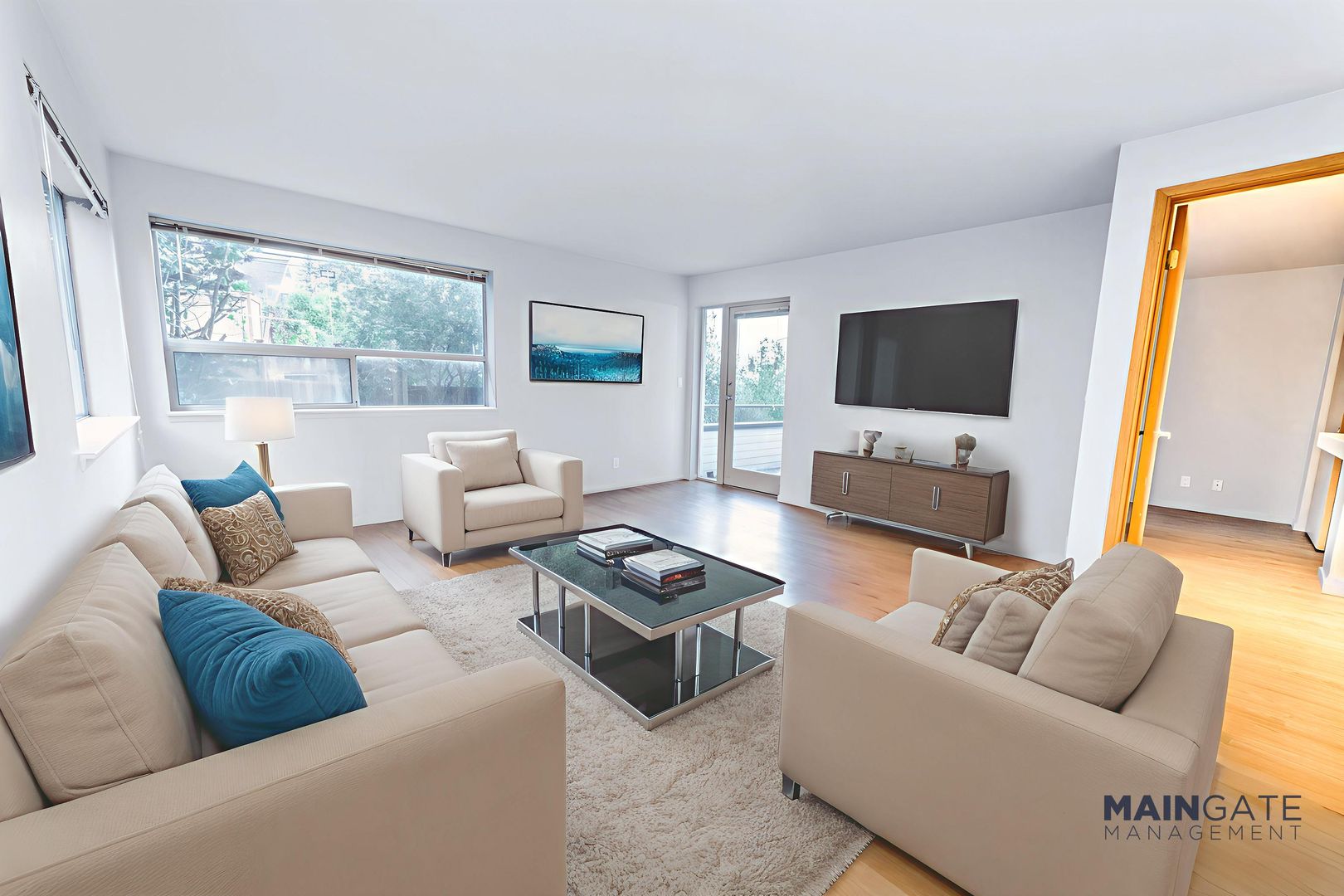 Welcome to Terrace Villa Apartments – Unit 301, a bright and spacious 2-bedroom, 1-bath apartment in the heart of West Seattle. This corner unit offers excellent natural light, a functional layout, and comfortable living space perfect for roommates, work-from-home setups, or anyone looking for extra room.